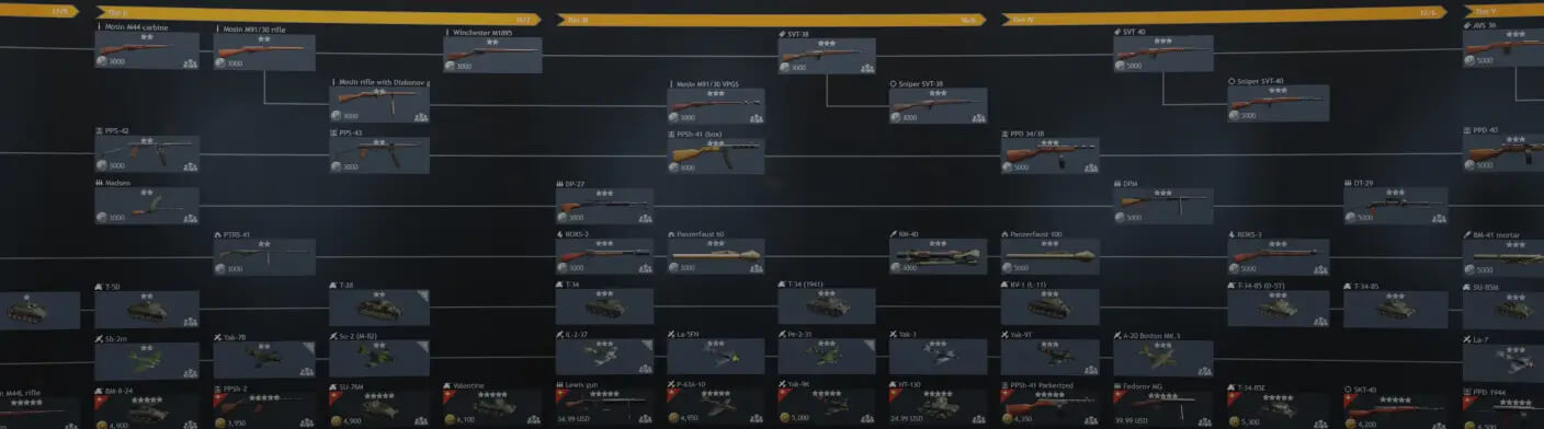 Open "Research" - in this progression window you can choose where the experience you gain in the next battles will go. When enough experience is accumulated, the corresponding equipment will become available for purchase. The content is divided into tiers. To open a new tier, you need to unlock enough equipment and vehicles at the previous tier.