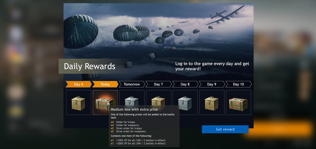 Daily rewards will be given out every day at the time you first login. They will range from experience boosters to bronze, silver and even golden logistics orders for troops, weapons and vehicles!