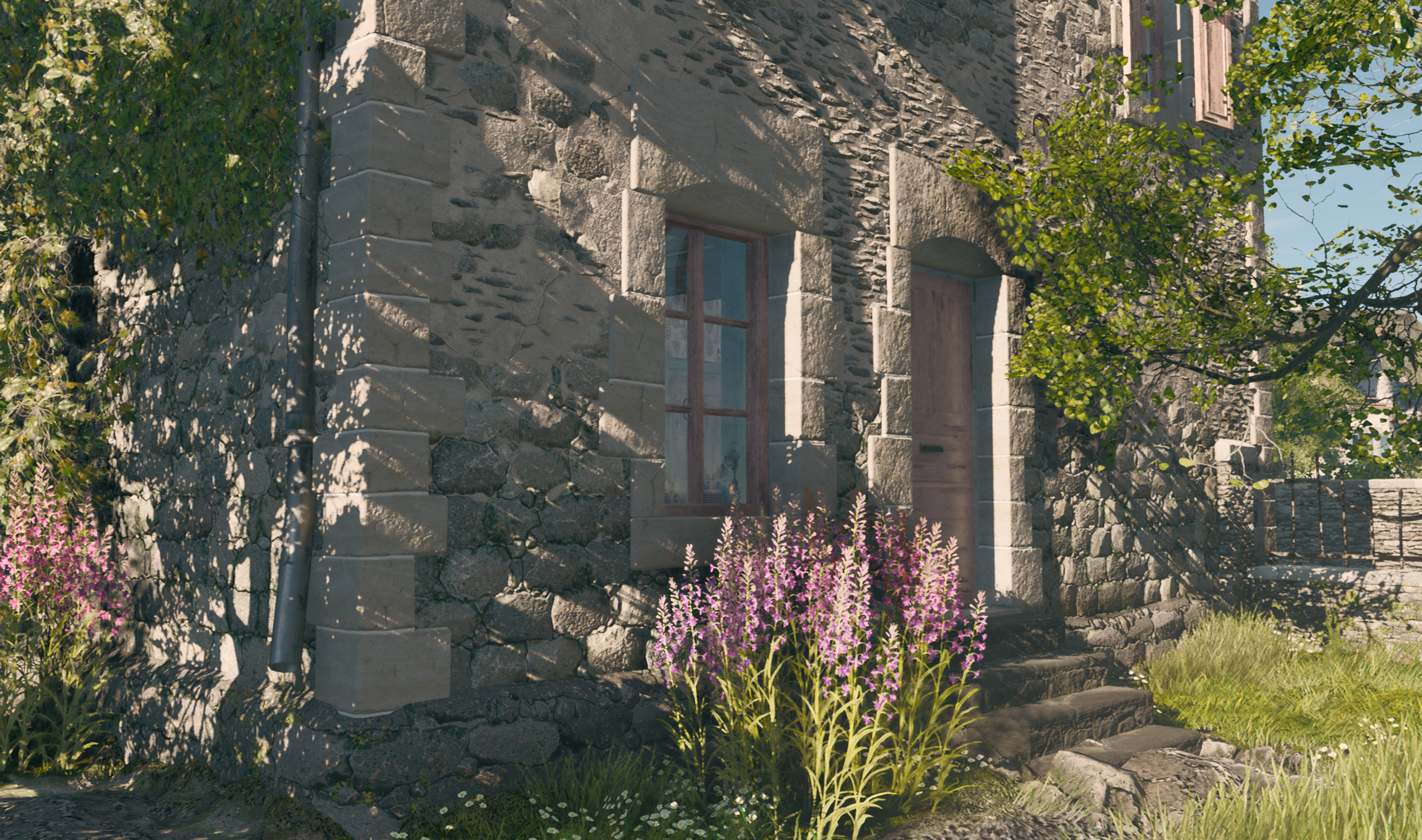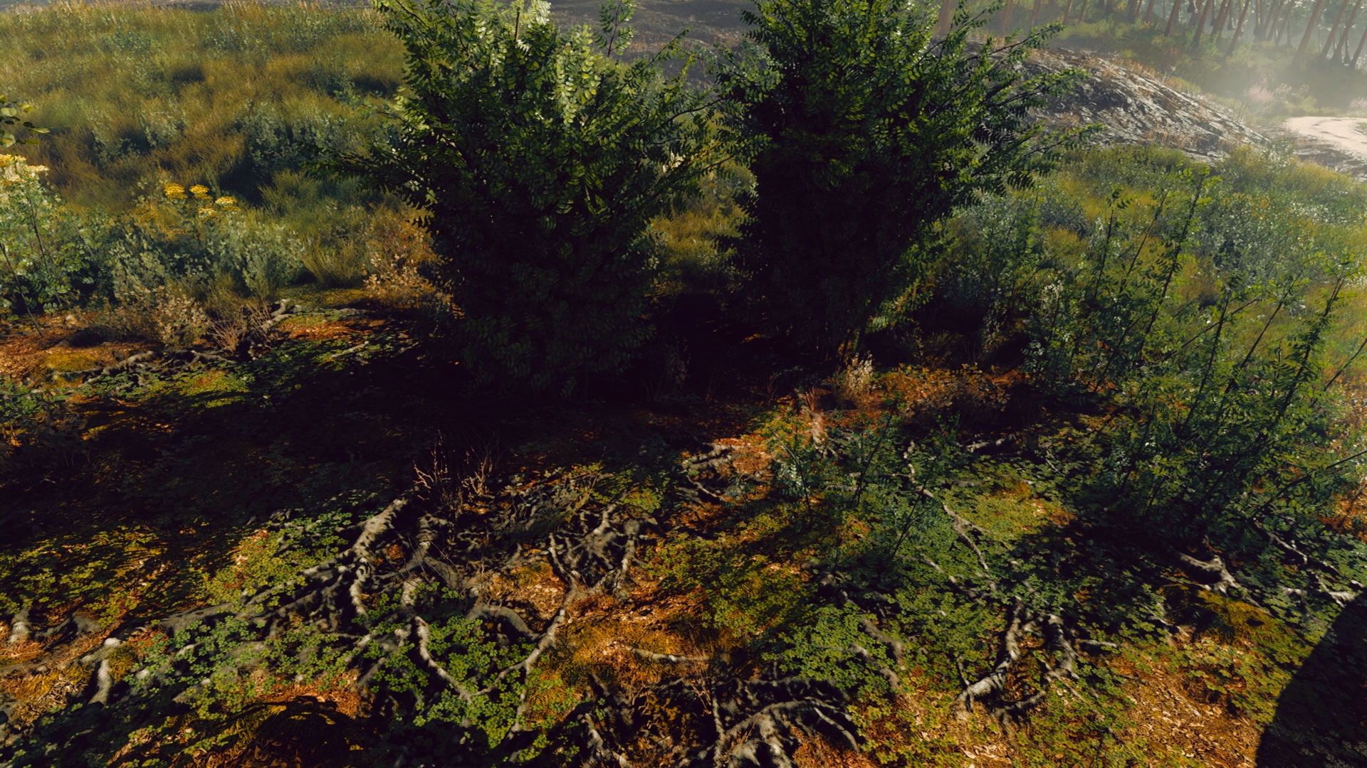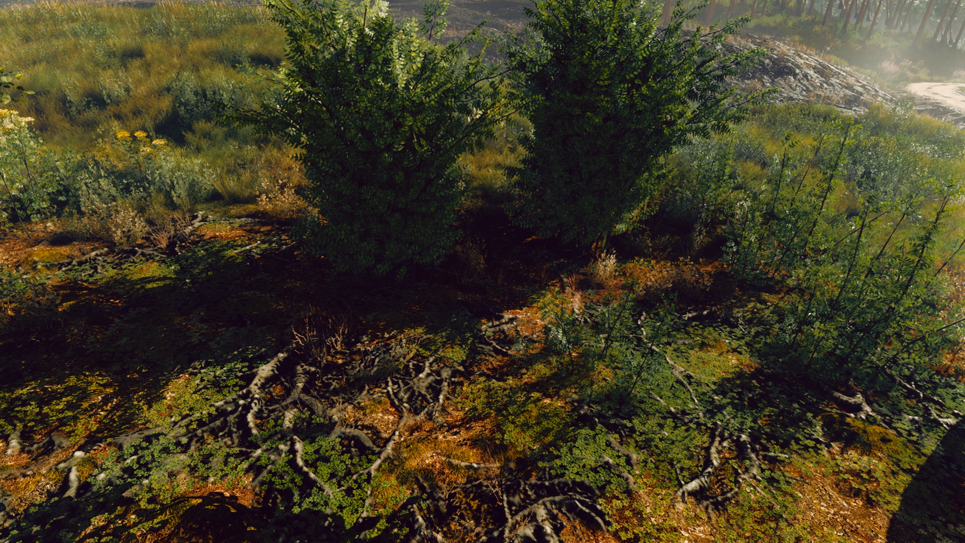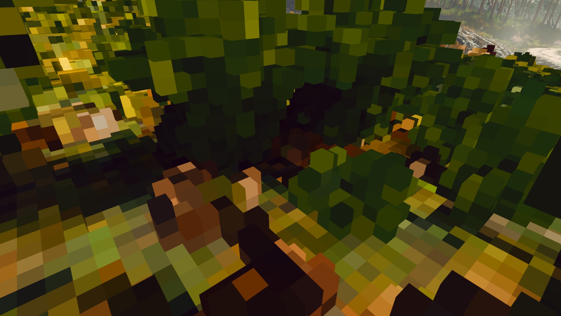 If we have opaque geometry which is very sparse in the scene but still mostly transparent (Figure 9), it’s voxel representation becomes inadequate (Figure 10). As voxels are not-transparent to light rays it will cause over darkening of underlying geometry, such as terrain below grass and bushes. There are two ways to mitigate that. First, we can totally skip such pixels in the 5.1 step of the algorithm (based on g-buffer information, such as material information). Second, if we store opacity information in our voxel scene representation (as a separate volume texture or alpha channel of the scene voxel data) we can allow semi-transparent voxels in the scene. In this case, the ray traversal 4.3 algorithm should be modified to well-known accumulate-and-extinct light modification (such as in [Crassin et al. 2011]). In the 5.1 step of the algorithm, if a semitransparent pixel has been found, we can skip it’s voxelization if it’s corresponding scene voxel is already defined as completely opaque, or do not update it’s opacity (but update color).