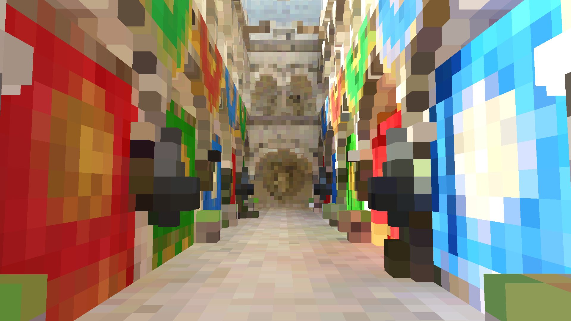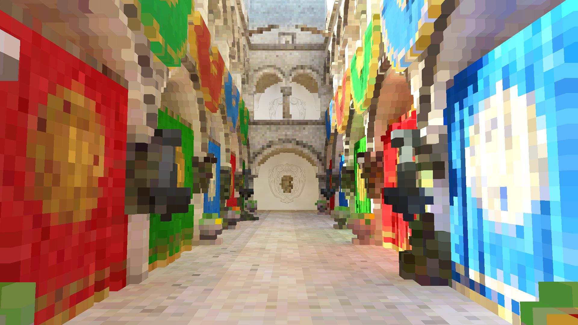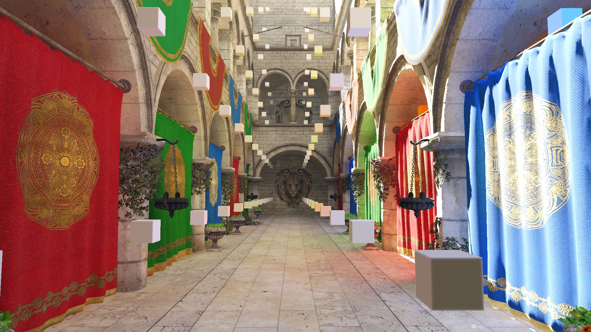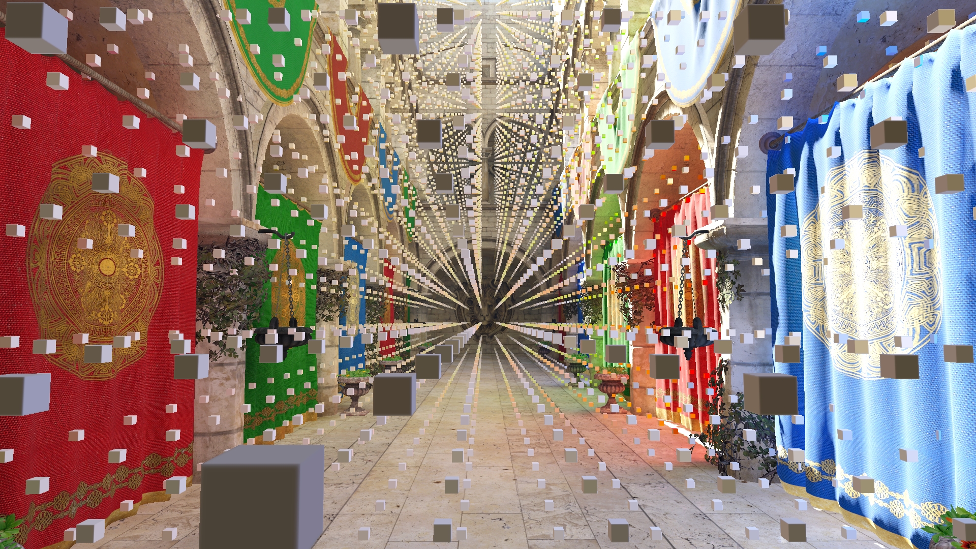 Fig. 4. Scene voxel representation clipmap, Sponza scene. Each grid has same texture dimensions and is nested inside coarser one in world space. Top-left: finest, bottom-right coarsest levels. |