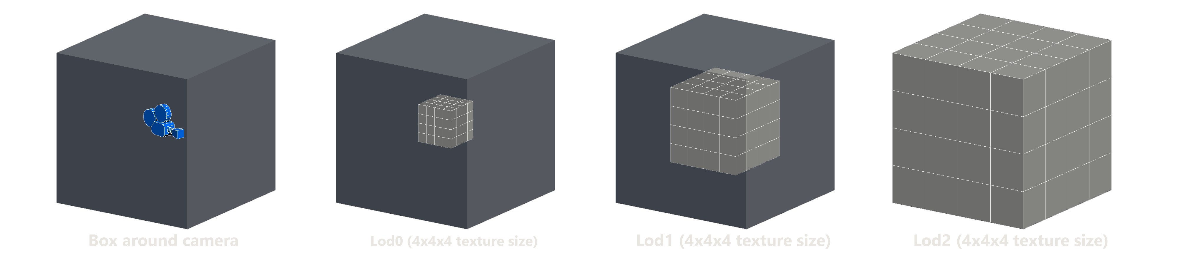 Fig. 1. 3d clipmap around camera. From left to right: Box around the camera, lod0 (finest) size is 1/8 of the box size, lod1 is 1/4, lod2 size is the whole box. All textures are of the same size in texels but different sizes in the world space, so texel (voxel) size doubles each next level.