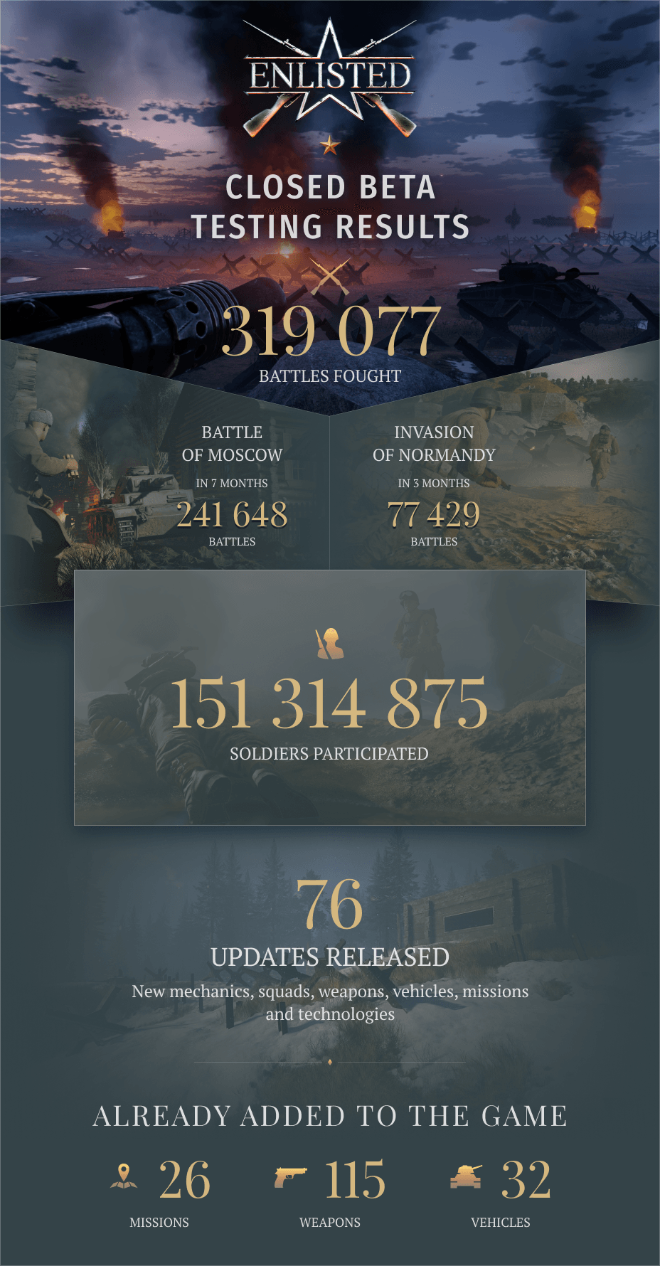 We continue to develop Enlisted and will be excited to introduce new campaigns, mechanics, missions and other content. In return, we would be very grateful if you could help us to improve the game by logging bug reports and suggestions on the Forums.