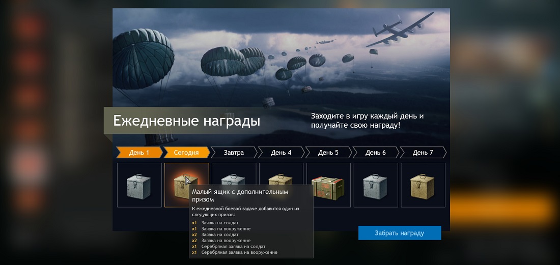 Эта награда выдаётся каждый день при первом вашем входе в игру. От бустеров к опыту до бронзовых, серебряных и даже золотых заявок на оружие, технику и солдат!