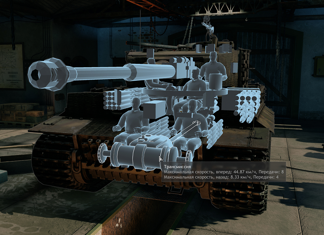 Вы узнаете не только секреты компоновки боевой машины, но и характеристики её основных узлов — если наведёте указатель, например, на трансмиссию или двигатель.