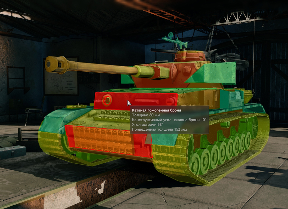 К тому же, вы можете навести указатель на точку брони и увидеть приведённые значения защиты при попадании в это место снаряда — именно такую толщину брони ему предстоит пробить при указанном угле попадания.