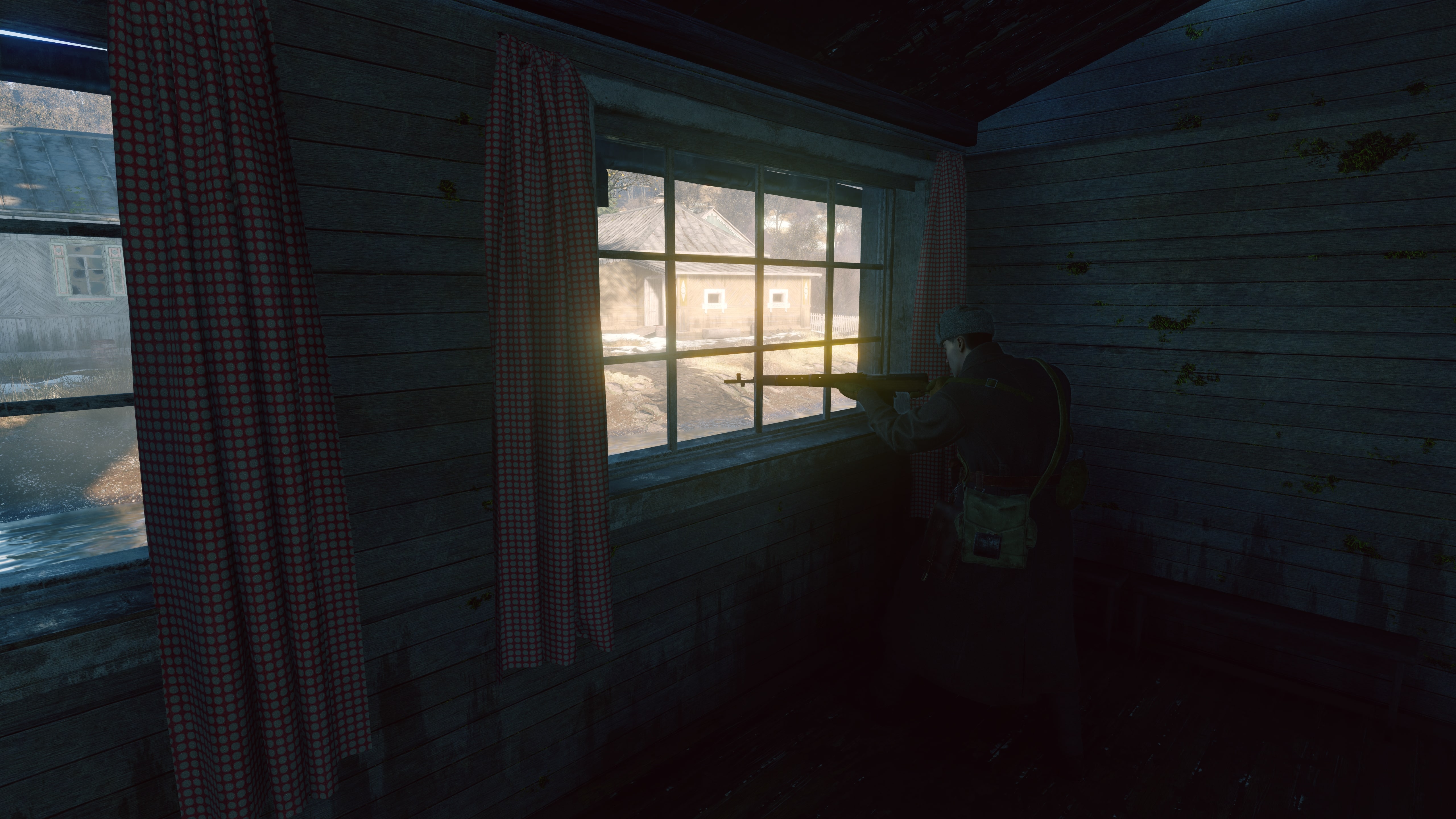 Тёмные бревенчатые дома. Адаптация делает их спокойно-серыми, и они смотрятся неплохо, но такая экспозиция приводит к тому, что снег и небо в окнах «слепит». Разумеется, для игрового процесса было бы лучше, если бы глаз не адаптировался так сильно к тёмному дереву — ведь наше внимание в немалой степени приковано к тому, что находится за окном.